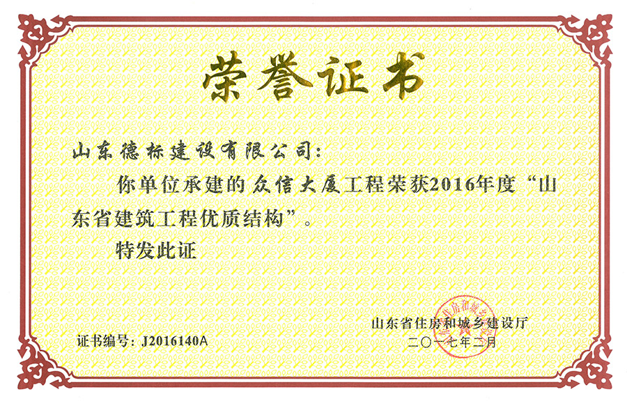 2016年度山東省建筑工程優(yōu)質結構-眾信大廈工程