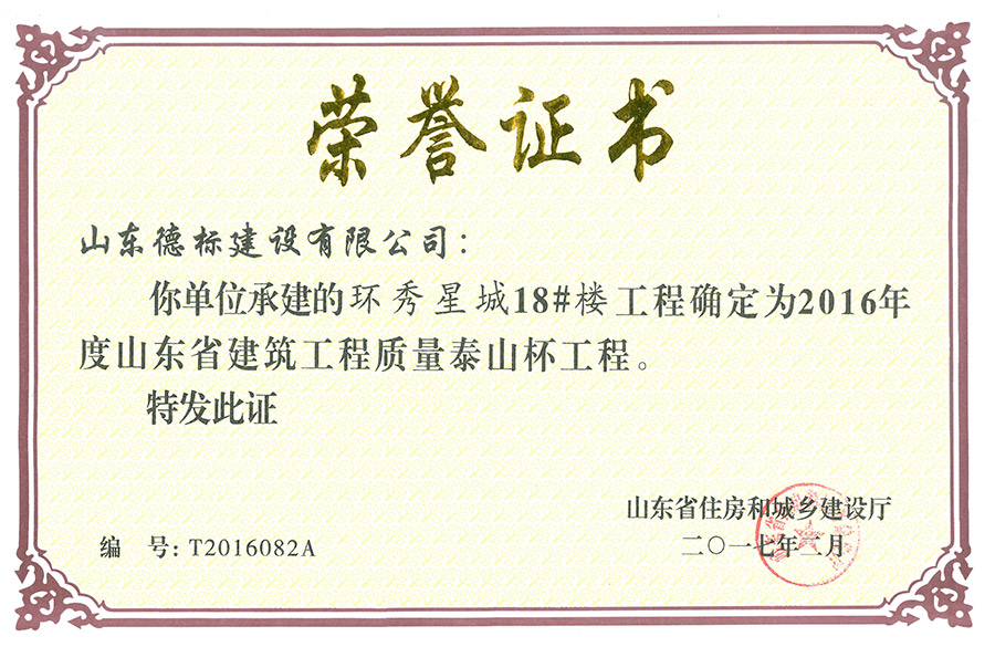 2016年度山東省建筑工程質量泰山杯-環(huán)秀18#樓