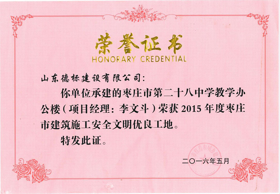 2015年度市安全文明優(yōu)良工地-棗莊市二十八中教學辦公樓